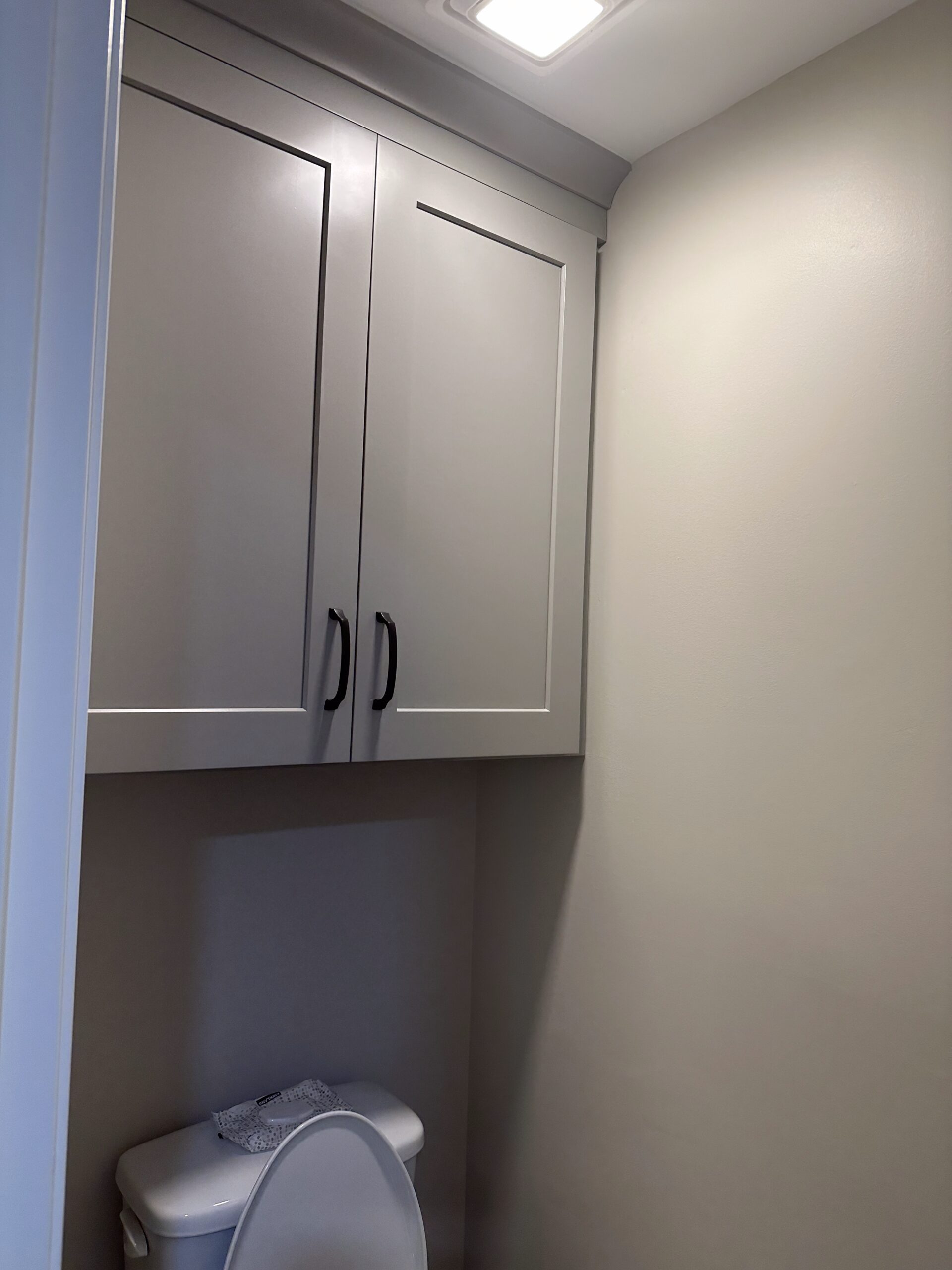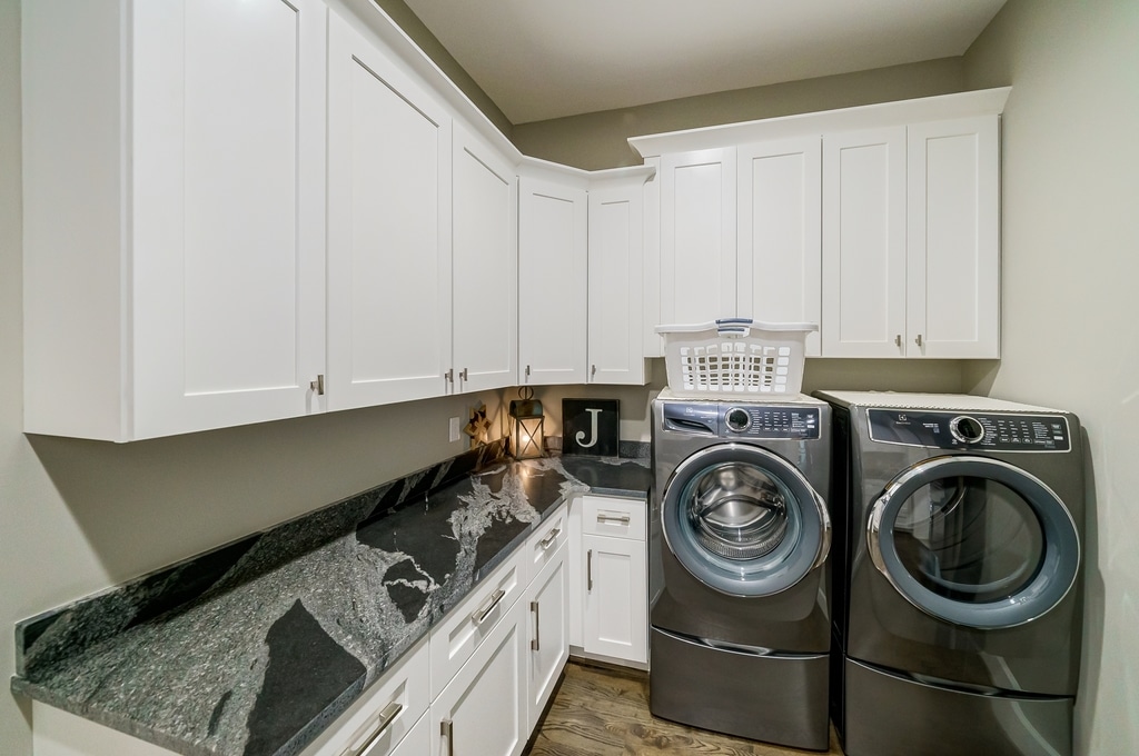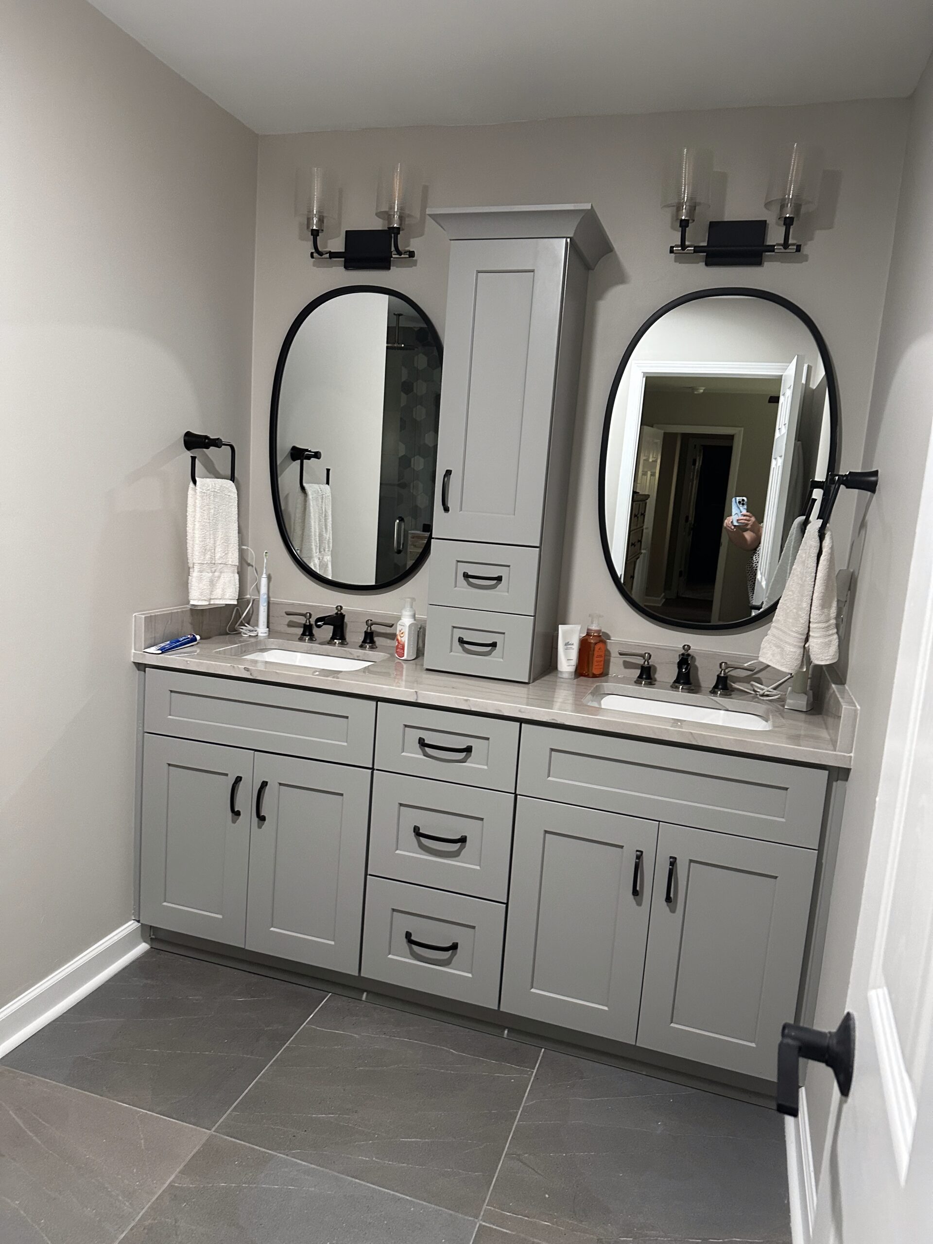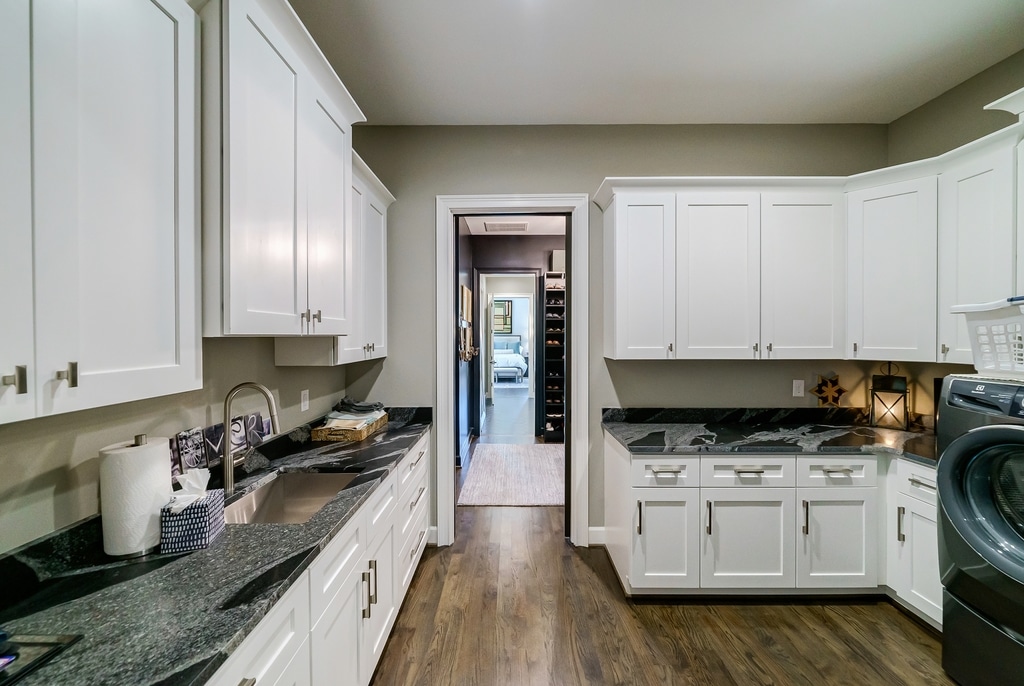 Complete cabinetry renovation featuring kitchen with custom island, master bathroom vanity, and coordinated laundry room cabinetry.