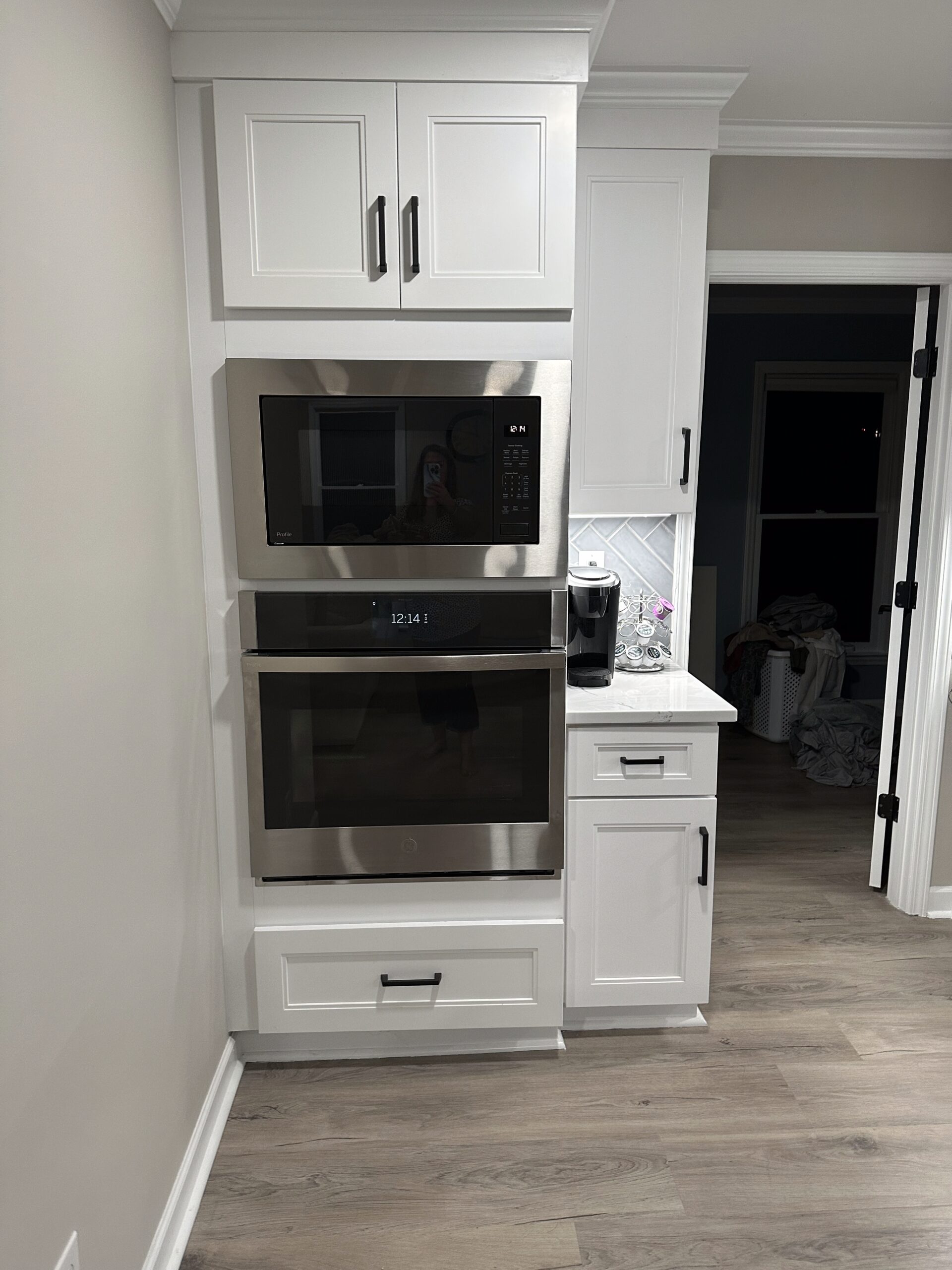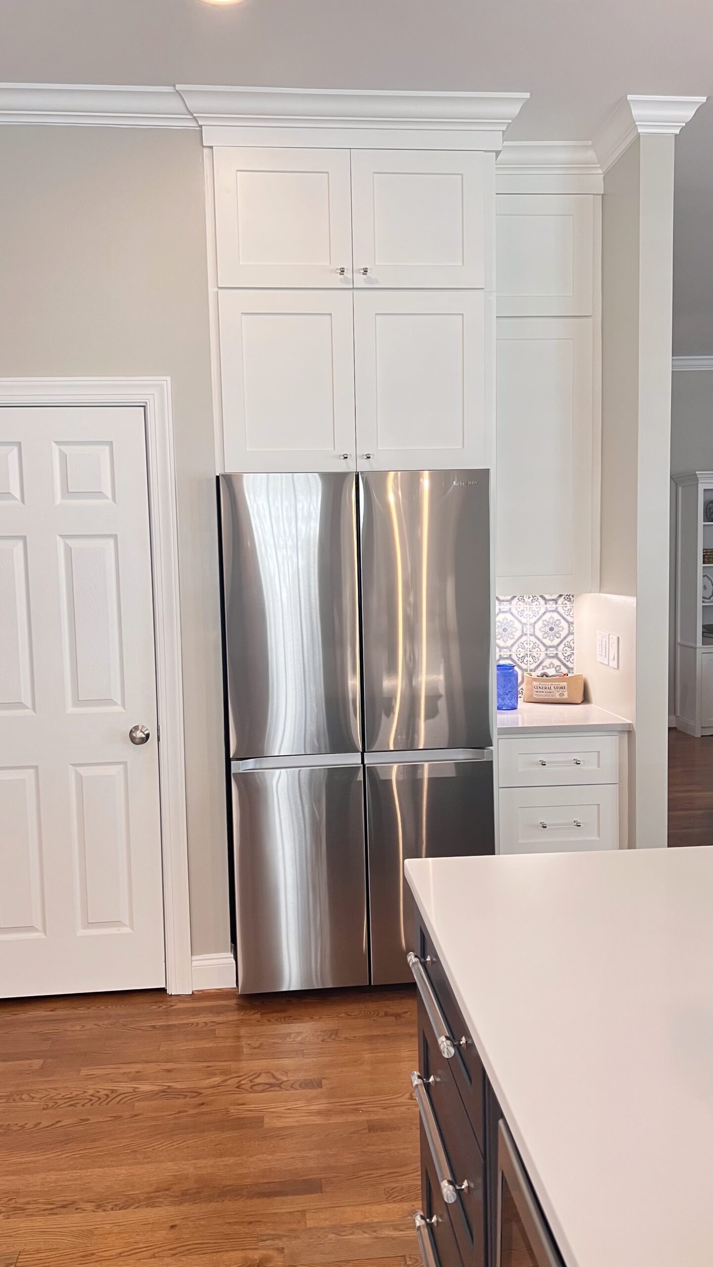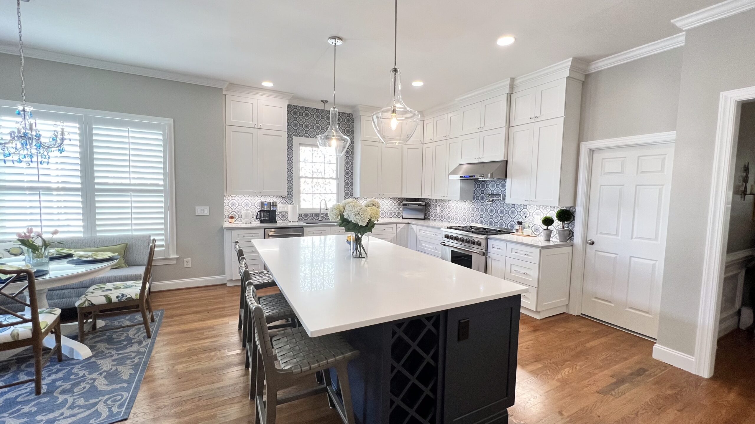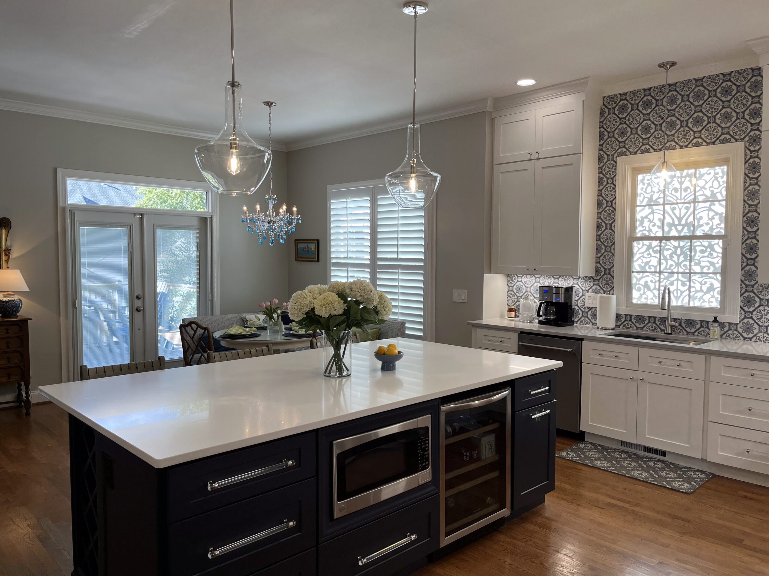 Kitchen renovation featuring white perimeter cabinets with contrasting dark island and floor-to-ceiling storage.