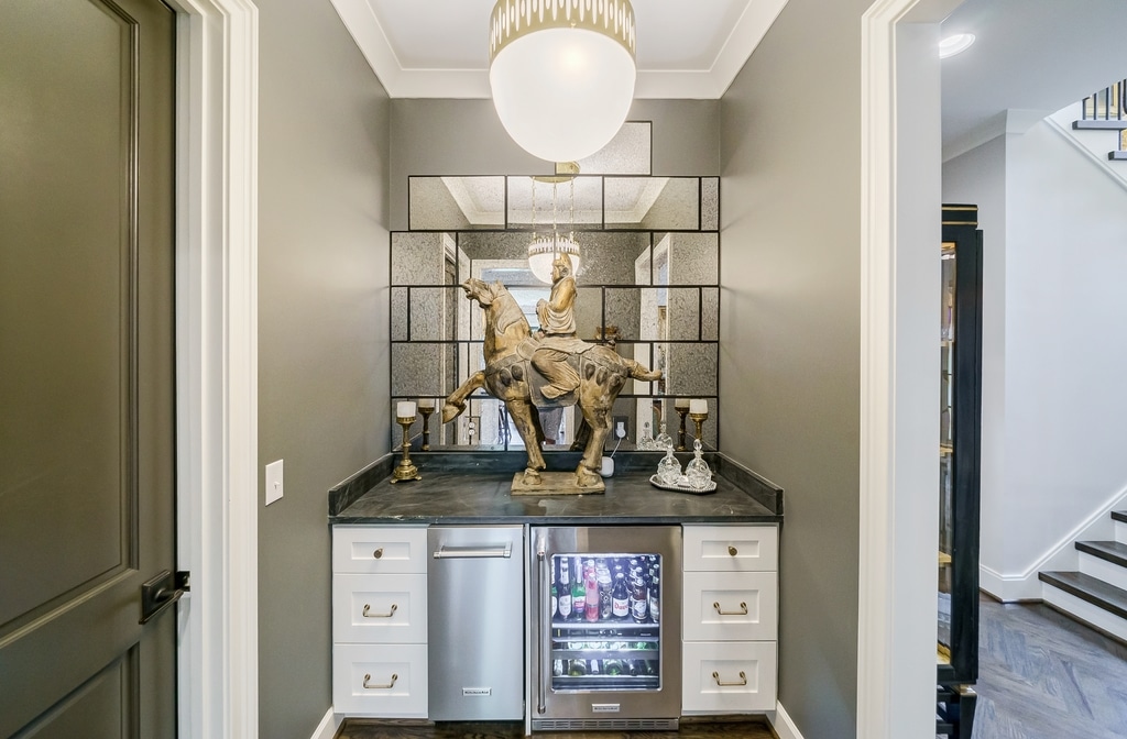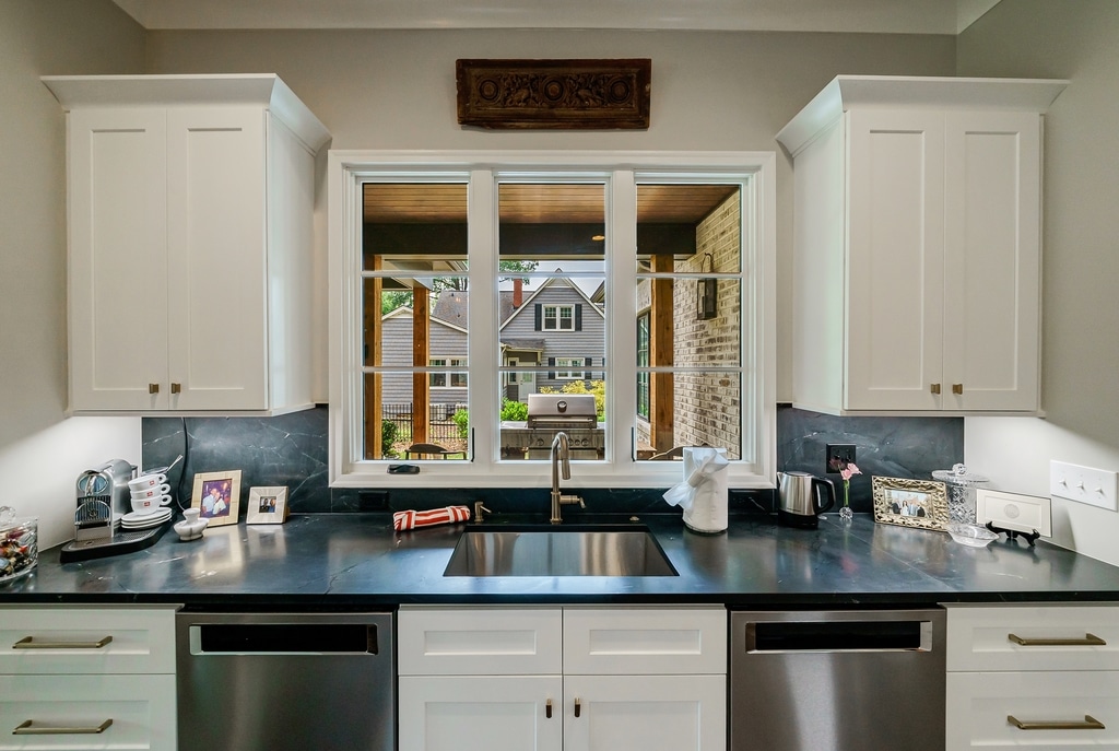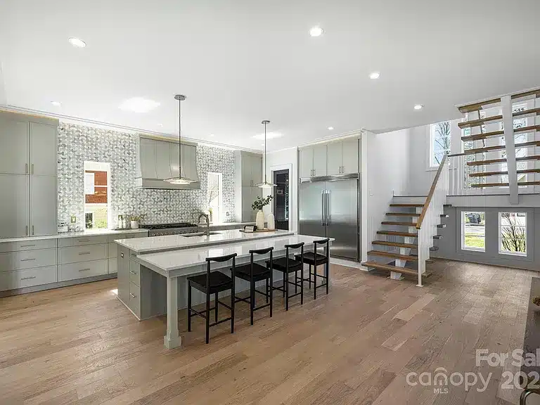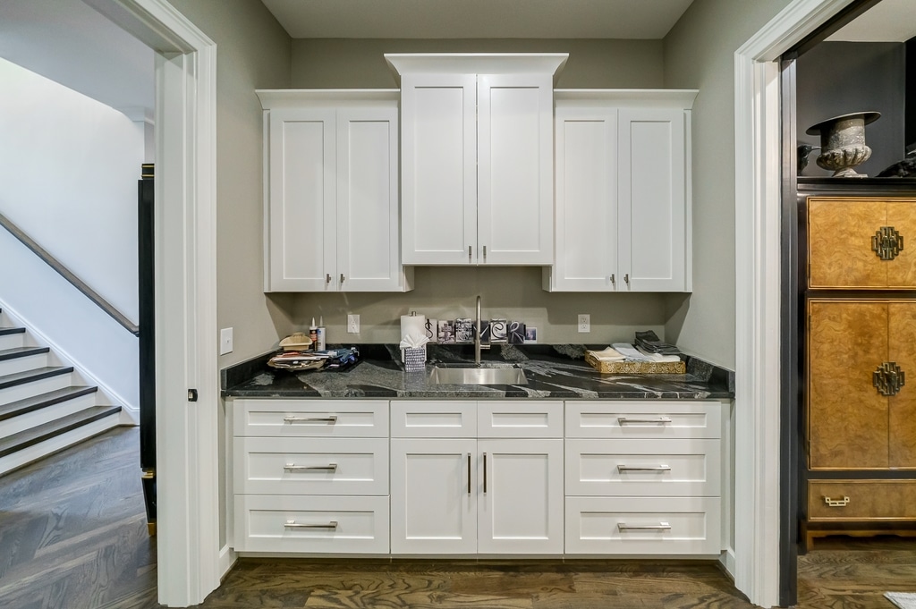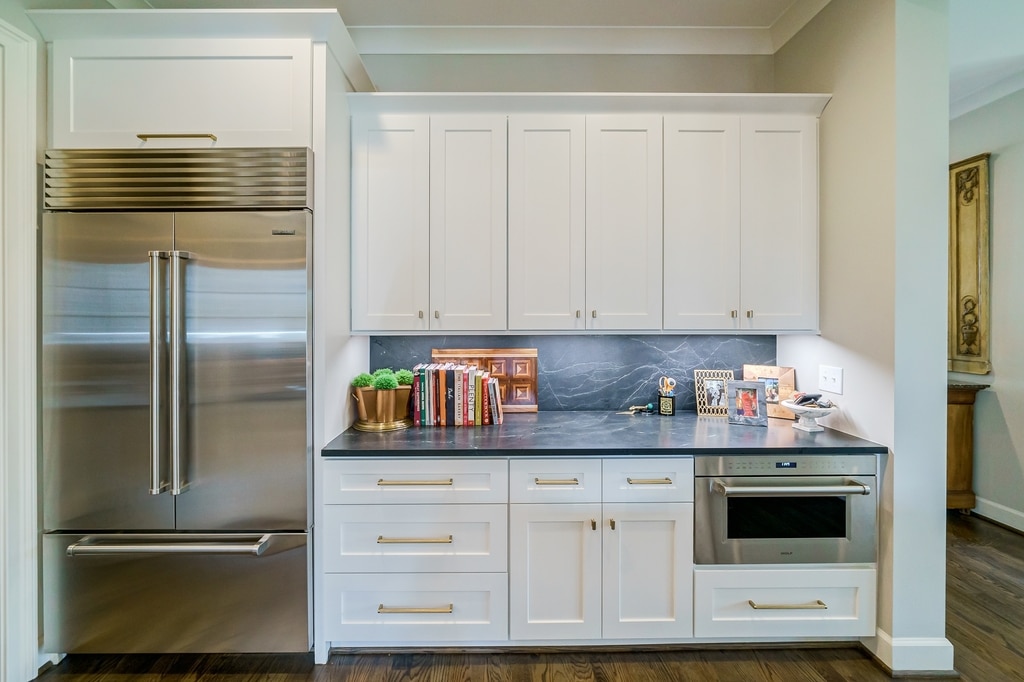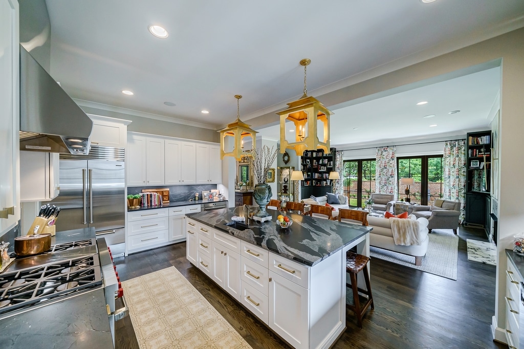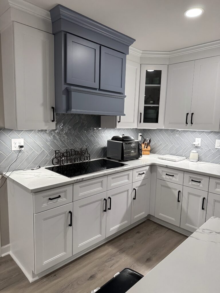 Kitchen renovation featuring white perimeter cabinets with contrasting dark island and floor-to-ceiling storage.