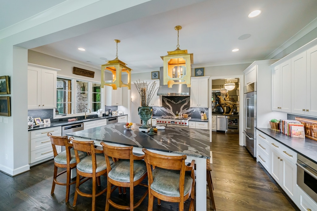 Complete kitchen renovation with custom island and coordinating bathroom vanities throughout the home.